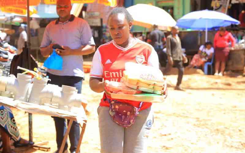 A trader sells food in Kisii town. most clients prefer eating at their place of work instead of going to eateries pushing most hoteliers to supply food for clients outside their hotels.[Sammy Omingo, Standard]