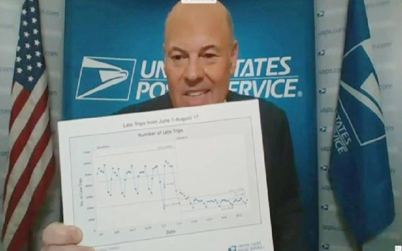 US Postmaster General Louis DeJoy holds up a chart showing the recent elimination of extra or late trips to deliver mail between June 1 - August 17, 2020, as he testifies via video feed in a screen capture made during a virtual hearing of the US Senate Homeland Security and Governmental Affairs Committee in Washington, US, August 21, 2020. [Reuters]