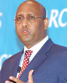 Barclays Bank of Kenya Managing Director Adan Mohamed announces the bank's results on Thursday. [PHOTO: MOSES OMUSULA/standard]