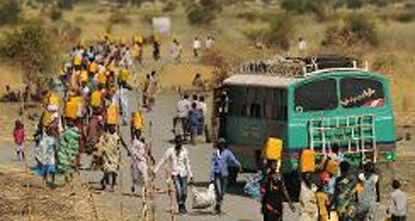 | Internally displaced people carry water from outside as they walk toward the entrance of a United Nations Mission in the Republic of South Sudan base in Malakal on February 6, 2014.Photo: AFP |