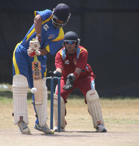 | Gurdip Singh, left, of Simba Club drive the ball as Mohit Lumb Keeper of Obuya Academy ready to save a miss during U20 Crown Berger Obuya Cricket Tournament at Simba Union Club, Nairobi on Thursday, August 21st, 2014. Photo/Jonah Onyango. |