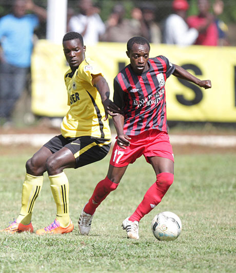 | KRA's George Mwangi driibles the ball past Tusker's Khalid Aucho during their KPL match at Kinoro stadium,in Meru on 11-05-2014.PHOTO/DENNIS OKEYO |