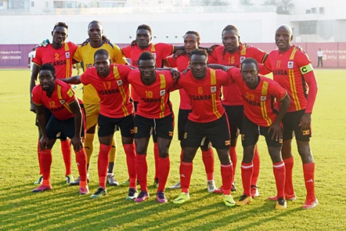 Uganda's starting eleven (top L to R) defender Joseph Ochaya, goalkeeper Denis Onyango, defender Timothy Awany, midfielder Geoffrey Kizito, midfielder Hassan Wasswa, forward Geoffrey Massa (bottom L to R), defender Denis Iguma, forward Farouk Miya, forward Luwagga Kizito, midfeilder Tony Mawejje, and midfielder Mike Azira pose for a group picture ahead of the friendly football match between Ivory Coast and Uganda at New York University Stadium in Abu Dhabi on January 11, 2017. AFP PHOTO
