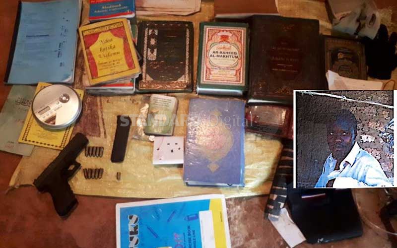 Some of the items recovered at Mohamed Rashid Mwatsumiro’s (Inset, right) home in Kwale. [Courtesy]