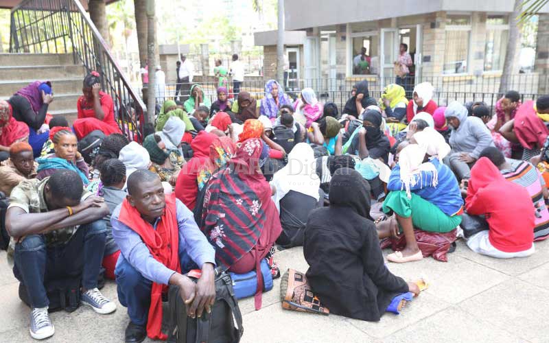 Some of the 71 foreigners from Uganda, Burundi and Tanzania arrested at the Jomo Kenyatta International Airport on transit to Oman on September 2018. The Ugandan government is cracking down on such employment schemes. [File, Standard]