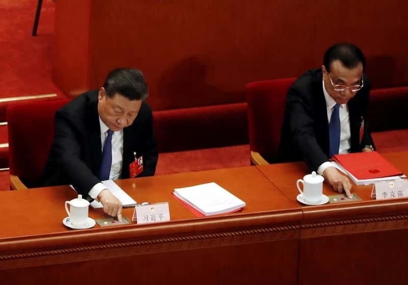 Chinese President Xi Jinping and Premier Li Keqiang cast their votes on the national security legislation for Hong Kong Special Administrative Region at the closing session of the National People's Congress (NPC) at the Great Hall of the People in Beijing, China May 28, 2020. REUTERS/Carlos Garcia Rawlins
