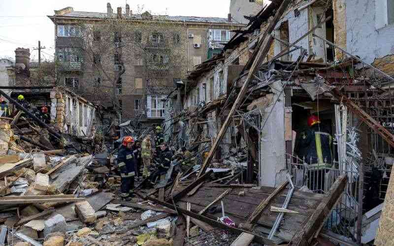 Workers clear debris in a two-storey residential building destroyed as a result of Russian drones attack in Odesa on April 24, 2026. [AFP]