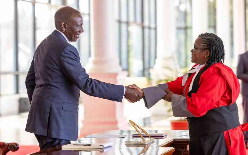 President William Ruto shakes hands with Justice Rachel Ng’etich at State House on January, 28, 2026. [PSC]