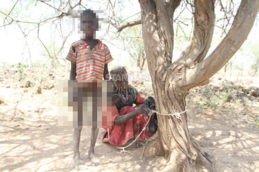 Chemket Angolei, 84, unties 8-year-old Karengit Lotukei from the tree he had been tethered to under the scorching sun in Cheptunoyo, Baringo County. The boy has a mental illness. [Photo: Kipsang Joseph/Standard]