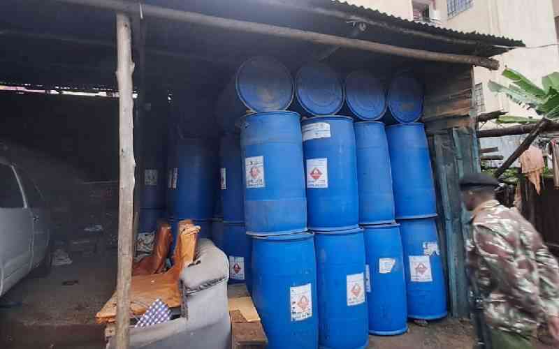 The National Authority for the Campaign Against Alcohol and Drug Abuse (NACADA) has seized 1,645 litres of illicit ethanol valued at approximately Sh4.1 million in Runda Estate, Westlands Sub-County, in an intelligence-led operation that led to the arrest of two suspects.