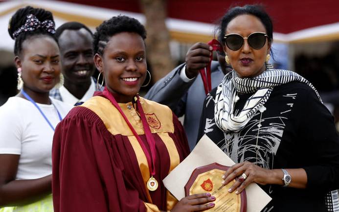 Cabinet secretary Ministry of Sports ,Culture and Heritage Amb Amina Mohamed (right) presents an award to the top 2018 KCSE students Mathenge Stephanie Kirigo at Moi High school Kabarak during the Moi High school Kabarak 40th Anniversary and and 15th prize and thanks giving day at the school on March 16,2019.Kamweru scored A of 84 points. [Photo:Kipsang Joseph/Standard]