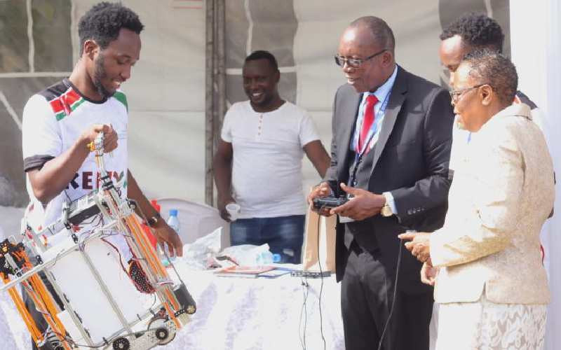 Leon Muli, a student at Zetech university demonstrates how the 'Omanyala' robot works to the Zetech vice chancellor Prof. Njenga Munene and Prof. Grace Njoroge, the Deputy Commission Secretary Division of Accreditation addressing. [Denis Kibuchi, Standard]