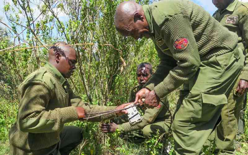 Solomon Mureithi (right) leads his team from the Mau Eburu Forest Joint Surveillance Unit as they install a camera trap to monitor wildlife and curb illegal activities like poaching. [Kipsang Joseph, Standard]