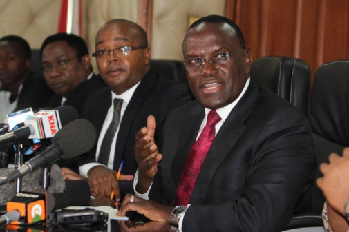 Health CS Dr. Cleopa Mailu addressing the press on the dilemma of doctors as they insist on CBA Iimplimentation during a press conference at Afya House. (Photo: Jenipher Wachie/Standard)