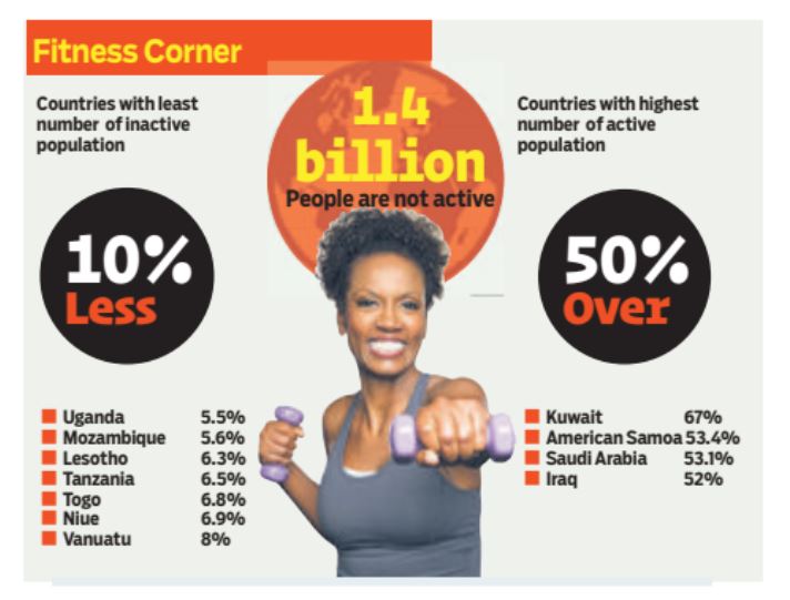 On the other hand, Kuwait had the highest number of people, 67 per cent, not active as recommended. The report shows globally, four countries – Kuwait, American Samoa, Saudi Arabia and Iraq – had half of their population not active enough.