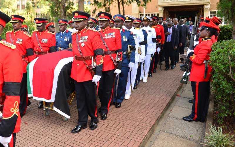 The casket bearing the body of former President Daniel arap Moi leaves Parliament Buildings for the Lee Funeral Home, last evening at the end of the first day of public viewing. President Uhuru Kenyatta led the public in viewing Moi’s body. [John Muchucha, Standard]