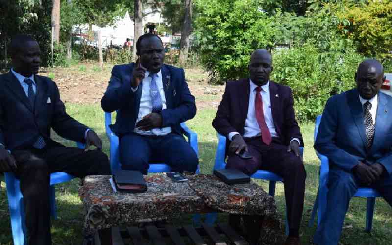 Seventh Day Adventist (SDA) Church elders and pastors when they addressed journalists at Kuoyo Kochia Main SDA church in Rangwe Sub-county on September 3, 2022. (James Omoro, Standard)