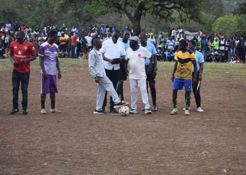 Silvance Osele (track suit) and Antone Okuta (red T-shirt) kick off a football match at Kigoto Primary School tournament in Suba South. (James Omoro, Standard)