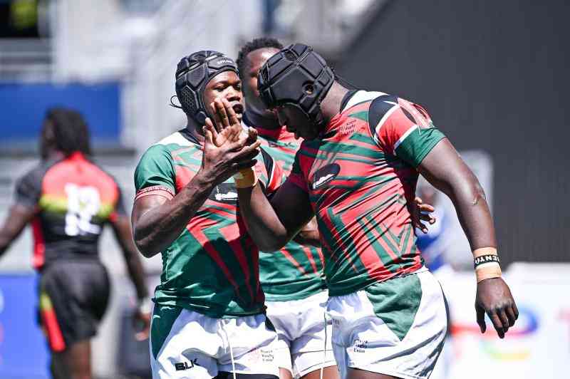 Kenya Simbas players celebrate after scoring a try against Uganda during their 2022 Rugby Africa Cup quarterfinals match at Stade Delort, Marseille in France, on July 2. [Rugby Africa]