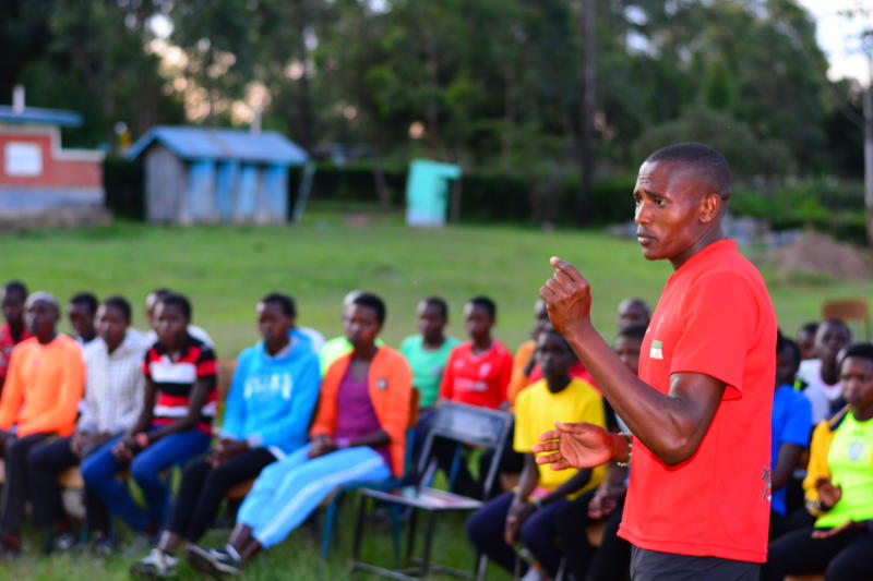 Ita Nao Leshan talking with athletes at Emanyatta Athletics camp in Emuruo Dikirr. [The Standard Group]