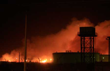 | Fire at the Yarmouk ammunition factory in Khartoum on Tuesday. [Photo: Reuters] |