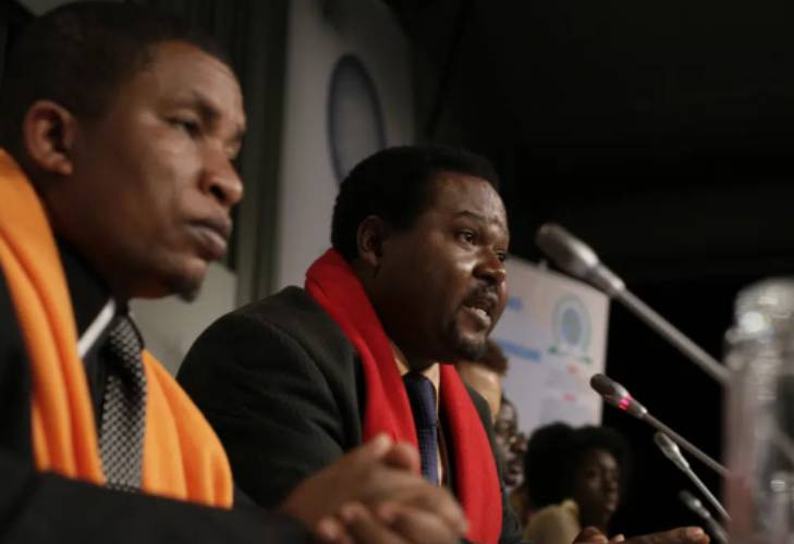 Coordinator Mithika Mwenda, left, and committee member Augustine Njamnshi, right,at a press conference of the Pan African Climate Justice Alliance at the Climate Summit, in Copenhagen Denmark, on Dec. 10, 2009. Climate activists in Africa have expressed anger toward the United Nations climate agency, accusing it of allowing corporations and individuals with "dubious" climate credentials to "greenwash" their polluting activities by participating in its annual climate conference. [AP]