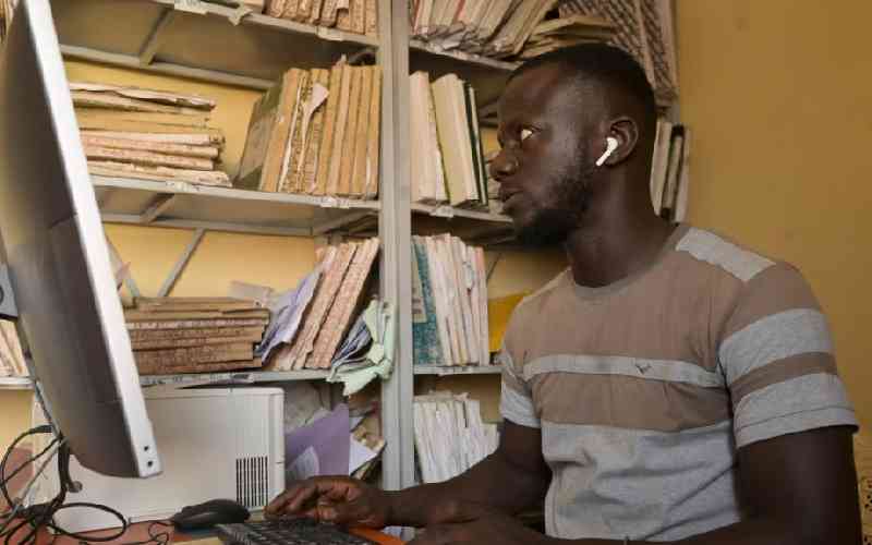 Dicakory Balde, a municipal official, works on the digital civil registry at the archive storage of the Parcelles Assainies town hall in Dakar, Senegal, July 19, 2024. [AFP]