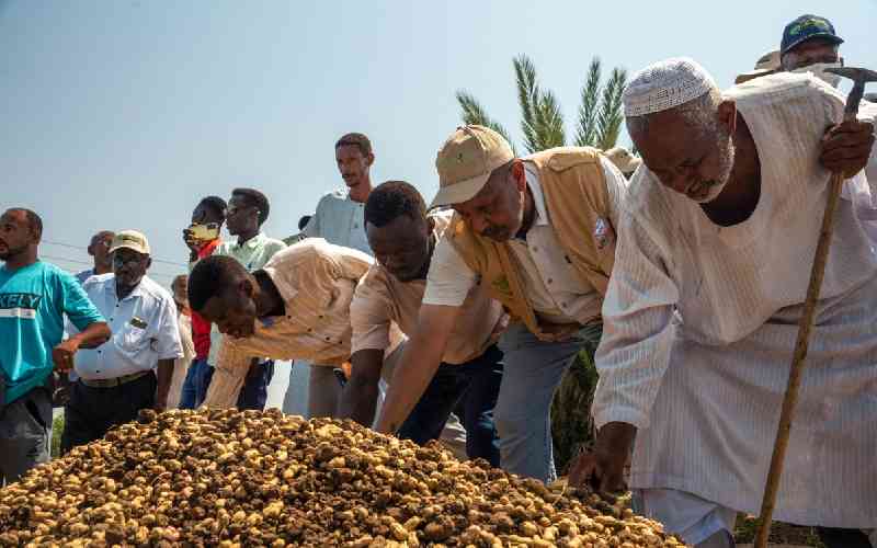 Farmers harvest peanuts at the New Halfa irrigated agricultural project in Kassala state in eastern Sudan on October 20, 2024. [AFP]