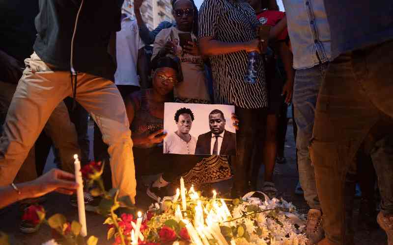 An image is held of Paulo Guambe (L) and advisor and lawyer Elvino Dias (R) both working with Mozambique's leading opposition candidate for the 'Obtimist party for the development of Mozambique' (PODEMOS), is held during a vigil the day after they were shot dead in Maputo October 19, 2024. [AFP]