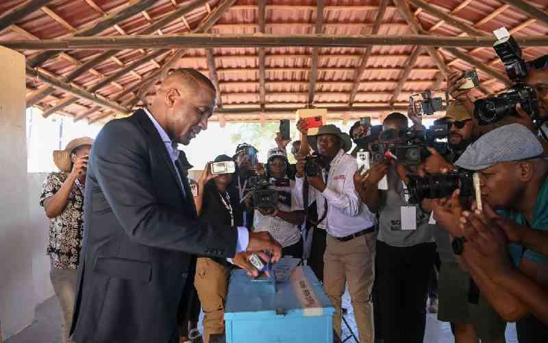 Umbrella for Democratic Change (UDC) presidential candidate Duma Boko (L) casts his ballot in Gaborone on October 30, 2024, during Botswana's general election. [AFP]