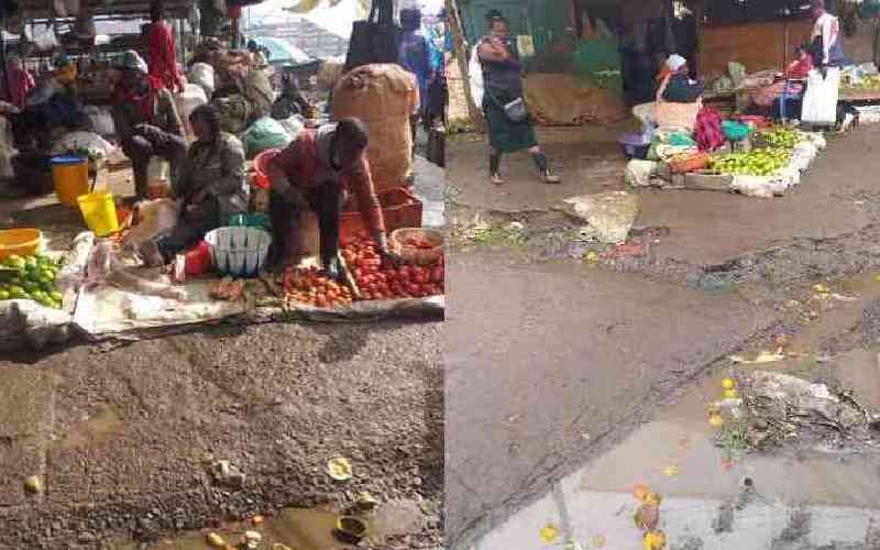 Traders at Muthurwa market in Nairobi sell food items next to flowing sewage. [File, Standard]