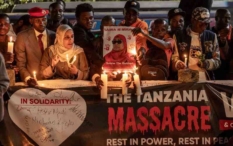 Protesters hold candles and banners during a memorial vigil to honour Tanzanians killed during post-election unrest, in Nairobi, on November 20, 2025. [AFP]