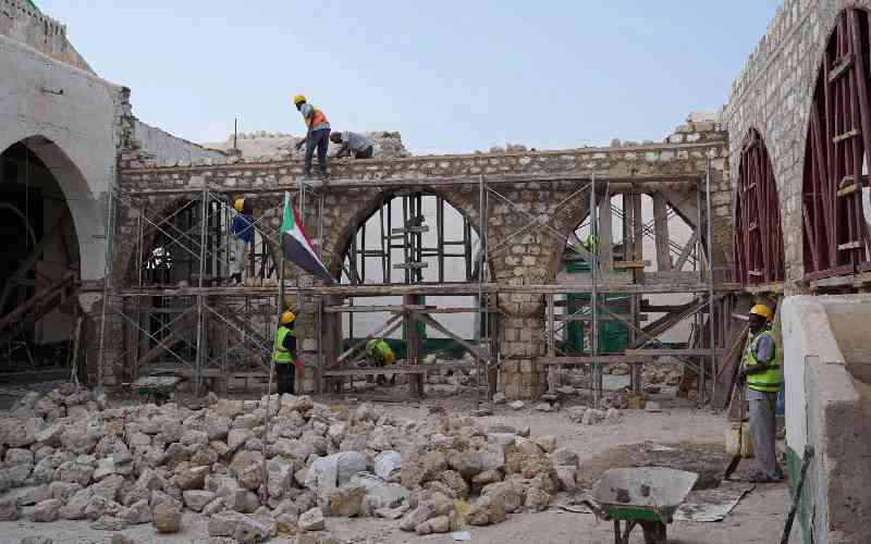 Labourers reconstruct a historical building in Suakin on January 22, 2026. [AFP]