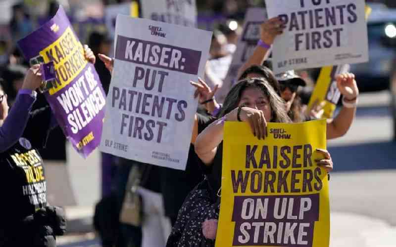 Martha Canul, foreground, a medical assistant at Kaiser, holds up signs along with medical workers and supporters as they protest outside of a Kaiser Permanente facility in San Francisco, Oct. 4, 2023. [AP Photo]