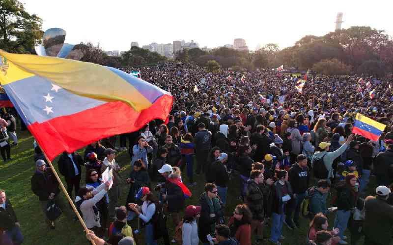 Aerial view of people taking part in a protest called by the Venezuelan opposition for election 'victory' to be recognised at the United Nations Square, near the Floralis Generica sculpture, in Buenos Aires on August 17, 2024. [AFP]