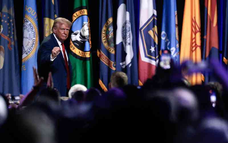 Former US President and 2024 Republican presidential candidate Donald Trump gestures to the crowd after addressing the National Guard Association conference in Detroit, Michigan, on August 26, 2024. [AFP]