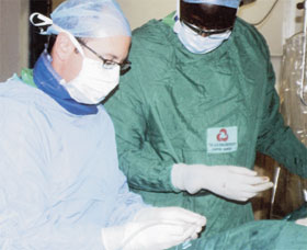 Cardiologists Neil Brass (left) from Canada’s Royal Alexander Hospital and Harun Otieno perform a pulmonary valvuloplasty procedure at Aga Khan Un