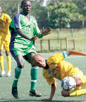 KCB’s Job Omuse Endriseh (left) challenges Mathare United’s Titus Mulama in a Kenyan Premier League match at the City Stadium on Sunday. Photo: Bonifa