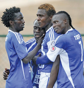 Sofapaka’s (From left) Said Idrisa, John Baraza, Hugo Nzoka and Thomas Wanyama celebrating after beating Simba, Tuesday. [PHOTO: STAFFORD ONDEGO/STAND
