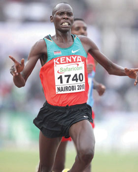 Wilson Kiprop wins the 10,000m gold in the 17th edition of the Safaricom Senior African Athletics Championships at Nyayo Stadium, Wednesday. [PHOTO: S