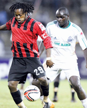 AFC Leopards’ Demonde Selenga (left) and Gor Mahia’s Chris Wekesa during the ill-fated KPL match on Saturday at Nyayo National Stadium. [PHOTO: STAFFO