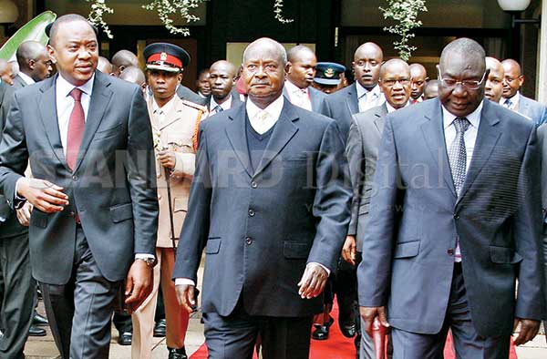 Presidents Uhuru Kenyatta (Kenya), Yoweri Museveni (Uganda) and Michei Djotodia (Central Africa Republic) arrive for the Special Summit of the Great Lakes Region for Heads of State and Government at the UN headquarters in Nairobi. [PHOTO: PSCU]