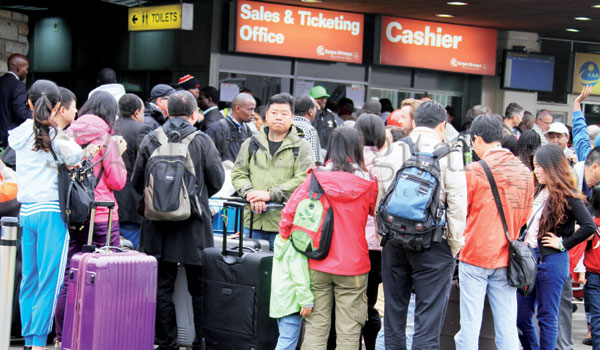 | Hundreds of passengers stranded at the Jomo Kenyatta International Airport in Nairobi Friday, as airlines struggled to resume operations after a fire destroyed the arrivals hall at the airport. [PHOTO: MOSES OMUSULA ] |