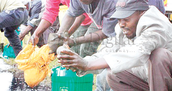 | Mwariki residents scramble for kerosene at the scene of an accident in which an oil tanker overtuned near Nakuru town on the Nairobi-Nakuru highyway yesterday. [PHOTO: HENRY KWENYA/STANDARD] |