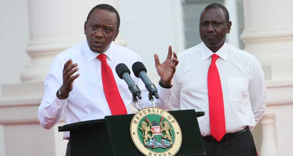 | President Uhuru Kenyatta (left) and his deputy William Ruto during swearing in of cabinet secretaries earlier this year. (Photo:File/Standard) |