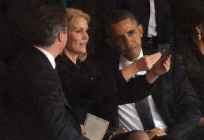 | US President Barack Obama and British Prime Minister David Cameron pose for a selfie with Danish Prime Minister Helle Thorning-Schmidt during the memorial service of South African former president Nelson Mandela at the FNB Stadium (Soccer City) in Johannesburg. Obama’s wife, Michelle, sat unsmiling next to her husband. [PHOTO: AFP] |