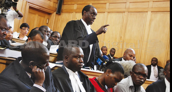 | Lawyer Paul Muite makes his submission Thursday during the hearing of a petition filed by three media houses challenging the migration to digital broadcasting. [Photo: Fidelis Kabunye/Standard] |