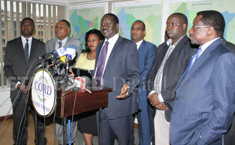 CORD leader Raila Odinga (centre) addresses the Press Wednesday at his Upper Hill office in Nairobi after a three-week mission to the US, Mozambique and South Africa. [PHOTO: COLLINS KWEYU/STANDARD]