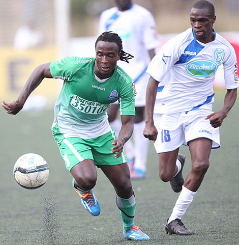 | Gor Mahia midfielder Baba Kizito, left, controls the ball under pressure from Thika united's Wycliffe Opondo during their KPL premier league match on 06-07-2014 at City Stadium.PHOTO/DENNIS OKEYO. |
