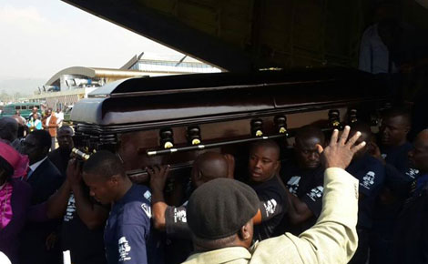 | The body of Fidel Odinga is removed from the plane at Kisumu International Airport for transportation to Kenyatta Sports ground where viewing will take place. |